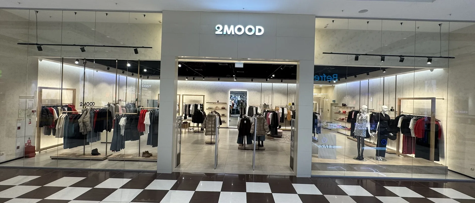 Товарный ассортимент 2MOOD относится к сегментам «средний» и «средний плюс». Представлены зимние модели одежды и обуви, базовые капсульные коллекции стиля кэжуал, трикотаж, деним и прочие позиции.  Средний чек покупки 20 000 рублей.